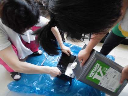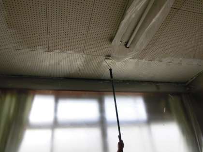 ローラーにペンキを付けて,塗るのですが,なかなか思ったように着色せず,何度も塗り重ねました。はしごや脚立を使い上にのぼり,上をずっと見たままの姿勢で,みんなよく頑張りました。
