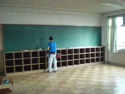 3,4年生教室の後ろのロッカーと掲示板が以前から傷んでおり,使用しにくかったので,この夏休みを利用して業者に修理してもらいました。夏休み明けからは使いやすくて安全なロッカーと掲示板が利用できます。