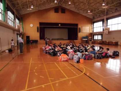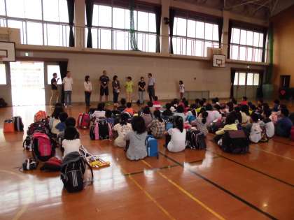 本日より四日間5年生が,長期宿泊学習に出発しました。体育館で出発式をしました。