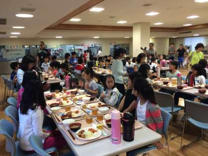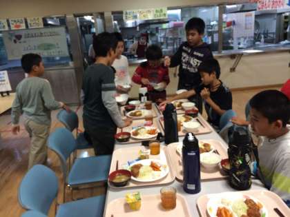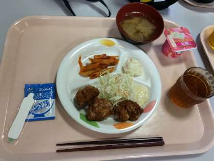 入所式の後は,オリエンテーションがあり,それぞれ部屋に荷物を入れました。そして夕食です。メニューは,からあげ・トマトペンネ・ポテトサラダ・豚汁です。