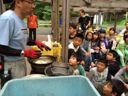 0826 5年長期宿泊学習 その23 公開日 2015/08/26 更新日 2015/08/26 学校の様子 野外炊さんです。所員の方の説明をしっかり聞き,雨の中ですが一生懸命美味しいカレーを作ります。