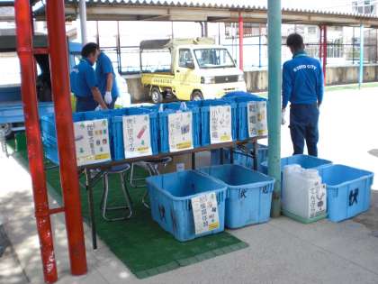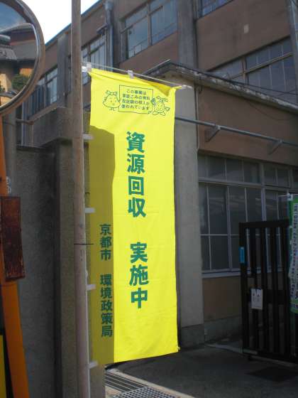 京都市では,区役所・支所等で回収している「資源物」と,正しい捨て方が分からないなどといった理由から家に置いたままになりがちな「有害・危険ごみ」を,まち美化事務所の署員の方々が出向いて回収を行う「移動式拠点回収」が実施されています。9月5日(土)の午前中,明親小学校の校庭で資源物の回収が行われました。校区にお住いの方々が次々と持って来られていました。明親小学校の北校舎廊下の校長室横にも,使用済てんぷら油の回収ボックスが常設されています。ご利用ください。