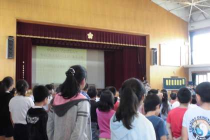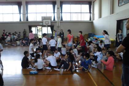 前期最後の児童朝会がありました。今月は,各委員会からのお知らせと縦割りグループでの仲良し遊びでした。しりとりやクマが来たぞゲームをしました。二部合唱もしました。