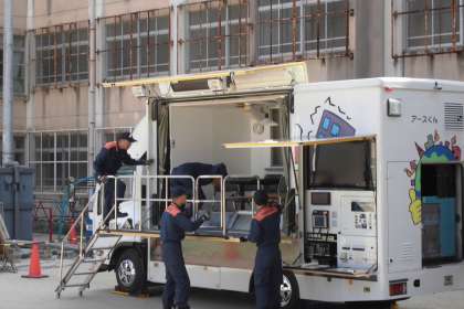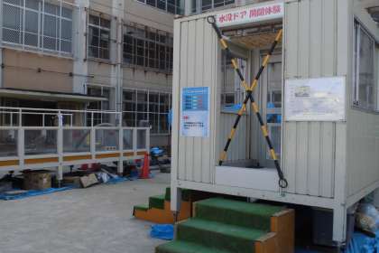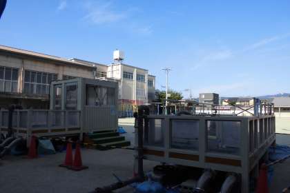 0915防災体験学習その1 公開日 2015/09/15 更新日 2015/09/15 学校の様子 7月に予定していた河川レンジャー(防災体験学習)が,雨天のため延期となり,本日,実施できることとなりました。これは,毎月学級で行っている安全学習に加え,近年多数起こっている災害に対しての意識を高めるための体験学習を行いたいと考え実施に至りました。 昨日の放課後,運動場に,体験施設が設置されました。