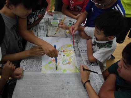 音読が終わった後に感想を発表してもらい,その後,2つのチームに分かれてぽんぽん山の色を絵の具で描きました。