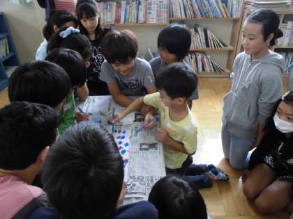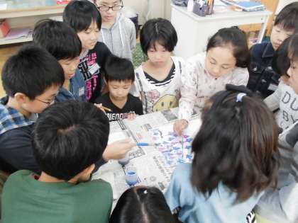若草学級1組 6年生との若草タイム その2 公開日 2015/10/01 更新日 2015/10/01 学校の様子 6年2組のみんなとは月の光に青々と染まったぽんぽん山の色を塗りました。月に照らされた美しい山の色を,筆の優しいタッチを意識して,丁寧にこつこつと協力して描きました。 6年生のみんなは,とても一生懸命に音読を聴いてくれました。 みんなで,心温まるお話を楽しんで味わい活動しました。 みんなで描いた,昼と夜のぽんぽん山です!