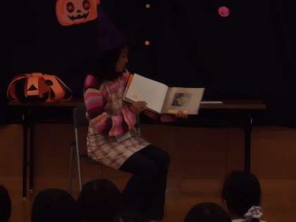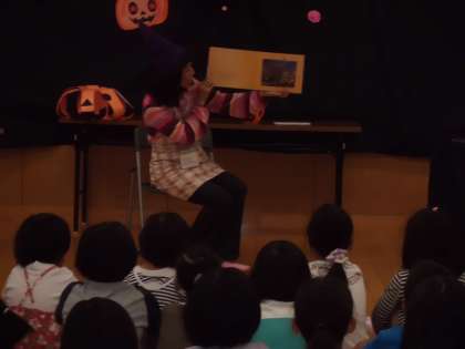 次に,よんでよんさんによる読み聞かせです。『おおきなかぼちゃ』エリカ・シルバーマン作 という本を読み聞かせしてくださいました。みんながよく知っている大きなかぶのお話に似たカボチャやおばけの出てくるお話でみんなお話の世界に引き込まれていました。