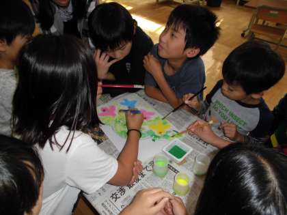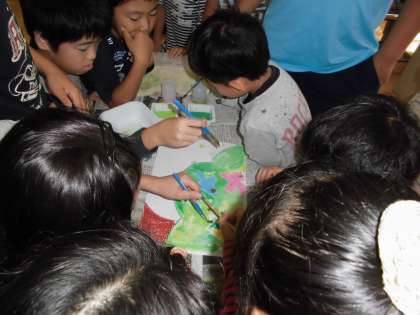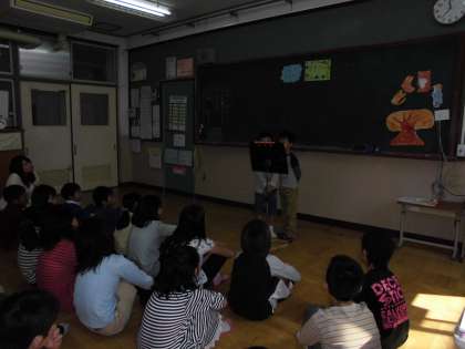 若草学級1組 5年生との若草タイムその2 公開日 2015/10/23 更新日 2015/10/23 学校の様子 5年2組のみなさんとの若草タイムの様子です。前回の若草タイムから,少し時間が経っていたので,若草1組の子どもたちはちょっと緊張していたのですが,5年生が静かに温かな雰囲気で聞いてくれたので,段々,落ち着いて音読することができるようになりました。 大きな木の色塗りでは,和やかな雰囲気の中,色合いの美しい木ができあがりました。