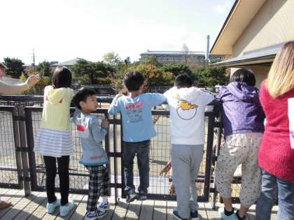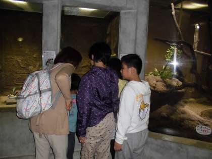 お弁当を食べた後は,各学校で集まり,いろいろな動物を見に行きました。「りんごが落ちているね。りんごを食べるんだね。」「これは蛇が脱皮した殻なんだね。長いね。」「蝙蝠さん,上手に棒につかまっているね。」など,いろいろな動物の様子を楽しみながらよく見て回りました。