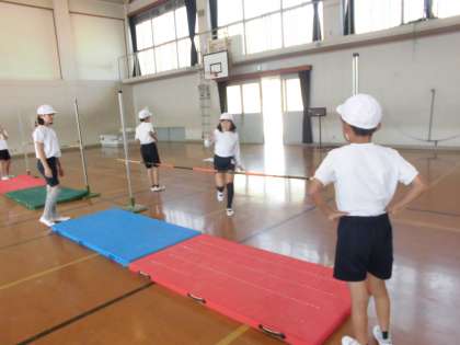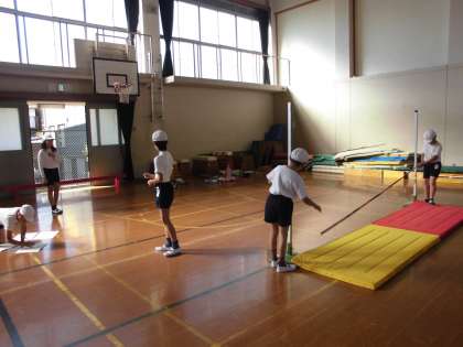 体育は『たかとび』の学習に取り組んでいます。初めはハードルの跳び方のように正面から跳び越える子どもも見られましたが,回数を重ねるごとにたかとびらしい跳び方で,斜めから竹のバーに沿っていくようにして跳べるようになってきました。準備片付けもきびきびと進められています。