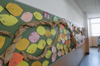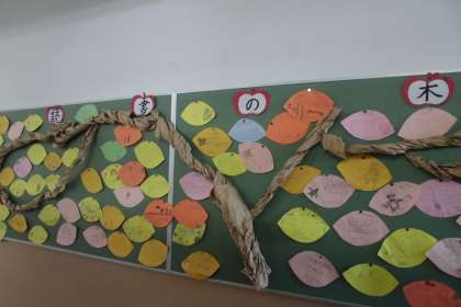 図書室前には,大きな読書の木が掲示されました。たくさんの色とりどり葉には,本のお勧めや紹介文が書かれています。おうちの方々にも,ぜひ,ご覧いただきたいです。