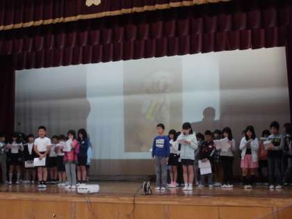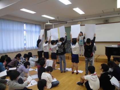 1109 4年生 学習発表会に向けて 公開日 2015/11/09 更新日 2015/11/09 学校の様子 『だれもが関わり合えるように』の体育館練習が始まりました。体の不自由な方の生活や日常的に使われている設備や物を知り,健常であるわたしたちがどういう風にして関わりを深め合っていくことが大切かなど子どもたち自身が調べ,考えた台本をもとに,練習を進めています。だれもが気持ちよく関わり合える,温かな社会を自ら作っていきたいですね。