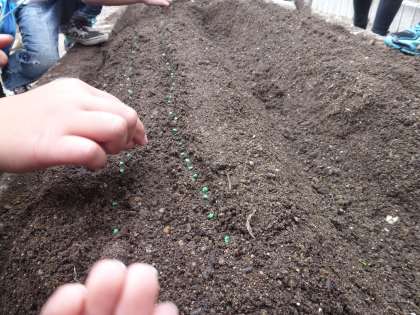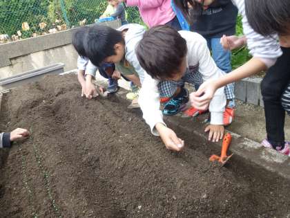 子どもたちはそれぞれ自分の担当の野菜を決め,この日は一足先に2組が種まきをしました。畝づくりから始めた子どもたちは,さっそく農作物を作る苦労を感じていたようです。