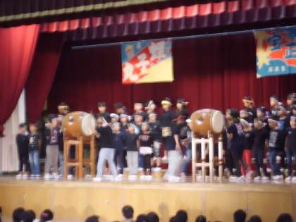 1119学習発表会その2 公開日 2015/11/19 更新日 2015/11/19 学校の様子 3年生の群読『祭り』 心をひとつに合わせて,太鼓を力強く,そして,リズムよくたたいていました。太鼓の音やリズムがとても心地よかったです。