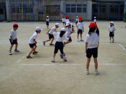 すがすがしい青空の下,1年生は体育で『ころがしドッヂボール』をしています。ルールを守り,楽しく活動できていることに感心します。