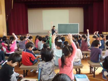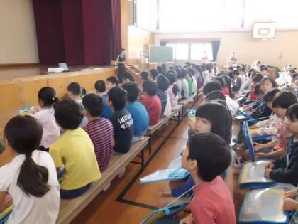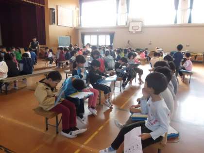 1・2年生の人権集会が体育館で行われました。この時期の児童は,相手のことが気になってつい口出しをしたり,けんかの言い合いで乱暴な言葉を使ったりすることが見られます。そのことを他の児童が言いふらしたり,無視しようと誘ったりする行為や,見て見ぬふりをすることは,いじめに該当します。いじめを予防するスキルを身に付けていくための授業です。
