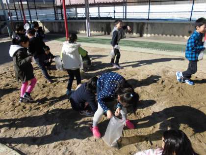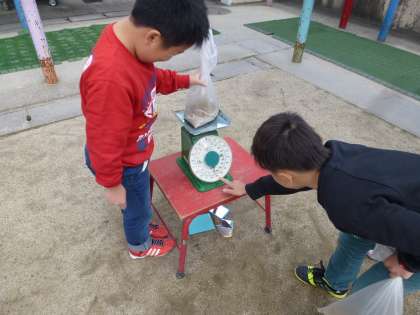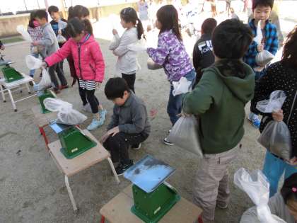 3年生 算数科「重さ」 公開日 2015/11/27 更新日 2015/11/27 学校の様子 突然訪れた寒波により凍える寒さになった今日, 子どもたちは算数科「重さ」の授業を外で行いました。 1kgの砂を袋に詰めて,はかりで計ります。 最初はなかなか1kgにならずに苦戦しましたが,そのうちだいたい1kgの「量感」をつかめるようになってきました。