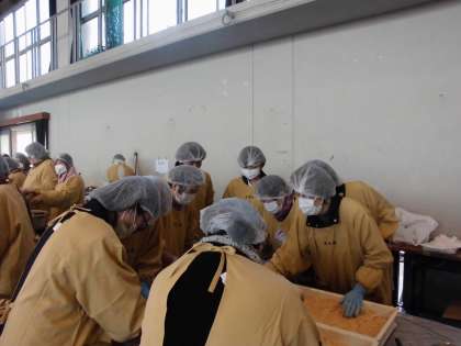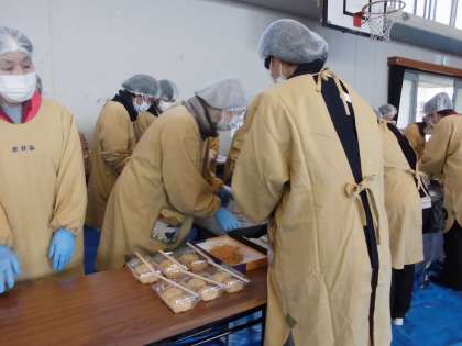 体育館では,「おぜんさい」や「きなこもち」がちゃくちゃくと準備されています。