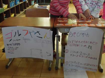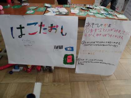 1208 保小連携その6 公開日 2015/12/08 更新日 2015/12/08 学校の様子 何のお店かわかるように看板も作っていました。淀保育所の皆さん寒い中を来ていただいてありがとうございました。