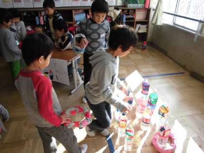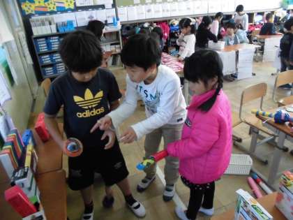 この日に向けて,それぞれのお店がおもちゃや景品など,たくさんの準備をしてきました。始めは緊張している様子でしたが,だんだん保育所のみんなと話すことに慣れてきて,優しい言葉かけが出来ていました。保育所のみんなのにこにこ笑顔を見て,2年生もとても満足そうな様子でした。