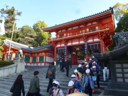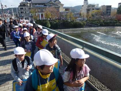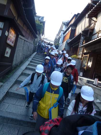 3年生 校外学習その5 京都市のまちの様子 公開日 2015/12/14 更新日 2015/12/14 学校の様子 とうふ作りを終えた3年生は,徒歩で学校歴史博物館へ。 その道中は,前期に社会科で学習した「京都市のまちに様子」のおさらいです。 産寧坂〜八坂神社に抜けるまでは,「神社やお寺が集まっているところ」四条通は,「お店やビルがたくさん集まっているところ」」です。京都市に住みながら,あまり行ったことがない子も多かったようで,興味津々の様子で街を観察していました。