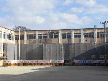 今回の改修工事は,大きくは2箇所です。1箇所は,東校舎運動場側の防球フェンスが鉄製のために錆びて茶色になった物を,北校舎に設置されているようなアルミ製のものに取り換える工事です。上の写真はその工事のために東校舎に足場を組んで防御ネットを取り付けた様子です。もう1箇所は,北校舎の鉄製の窓枠をアルミ製のものに取り換える工事です。真ん中の写真は,工事のために足場を組んでいる様子と,鉄製の窓枠を取り換えるために,まずアルミ製の防球フェンスを取り外している様子です。下の写真は,北校舎の北側の鉄製の窓枠を取り換えるために足場を組んでいる様子です。