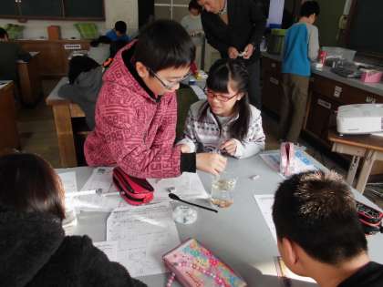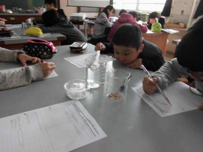 理科の「物のとけ方」の学習が始まりました。 塩や砂糖の解ける様子を調べています。