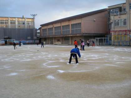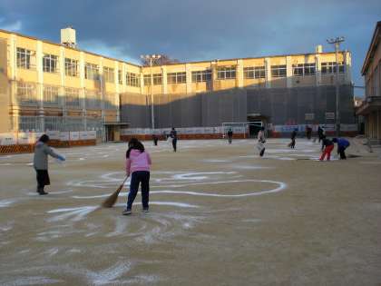 今週に入ってから,朝の冷え込みも強くなり,この時期本来の寒さが感じるようになりました。そこで,児童が帰ってから,教職員で凍結防止剤を撒きました。