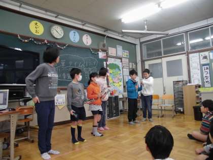 0120 自由参観その9 公開日 2016/01/20 更新日 2016/01/20 学校の様子 「若草タイム」3年生 2時間目,3時間目に3年生と若草学級との交流がありました。 若草1組では,「えりまきの花」という本の音読発表を聞き,みんなで画用紙に色を塗り「えりまき」を作りました。 若草2組では,パワーポイントで作ったクイズに挑戦したり,トーンチャイムとい楽器の演奏を聴いたりしました。トーンチャイムを演奏させてもらいましたが,音の出し方が難しかったです。