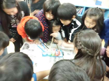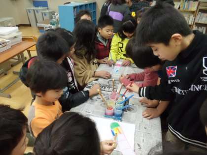 子どもたちは楽しそうに,塗る色を縦や横にしたり,幅のパターンを様々にしたりして工夫していました。色が混ざり合って濁りすぎないように,丁寧な筆遣いも頑張っていました。
