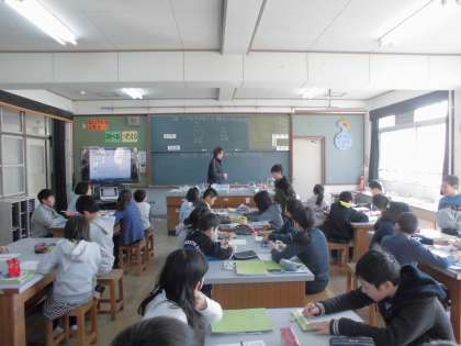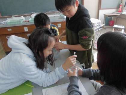 理科の学習の様子です。 グループで協力しながら,食塩のとける様子を調べています。