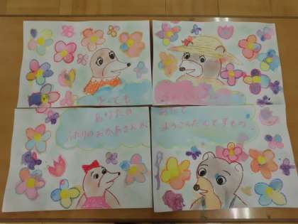 このお母さんの言葉を登場人物と花で囲んだ絵を描いて,花の色をみんなで塗りました。これがその,みんなで作った絵です。