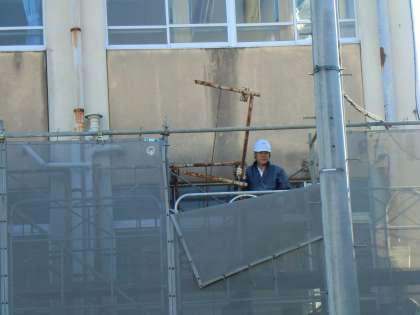 東校舎運動場側の防球フェンスを古くなって錆びた鉄製のフェンスから,錆びないアルミ製のものに付け替える工事が始まりました。上の写真が古い鉄製の防球フェンスを外しているところ,中と下の写真が外した後の様子です。土日を利用して順次作業が行われていきます。