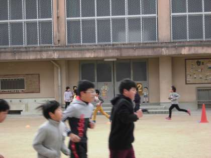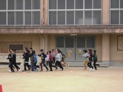 今日のジョギングタイムの高学年の様子です。 頬を赤くしながらはやいスピードで駆けぬけています。