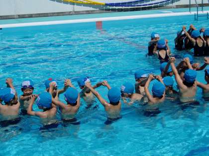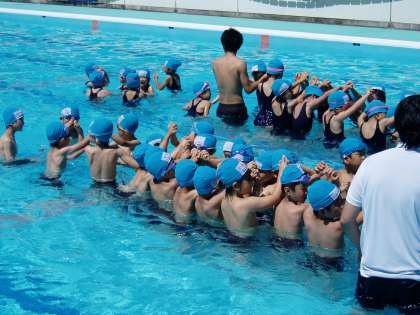 今日は晴天に恵まれ,水泳学習も本格的に進められています。1年生は,先日の低水位から,今日は約80CMの水位で学習をしました。友だちが手をつないで作るトンネルをうれしそうにくぐっています。