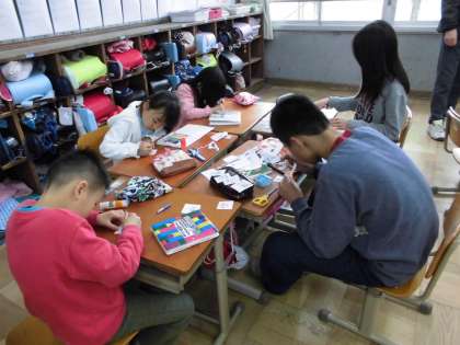 それぞれのなかよしグループの教室で,卒業する6年生にむけてのプレゼントを作っている様子です。