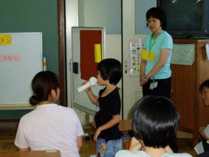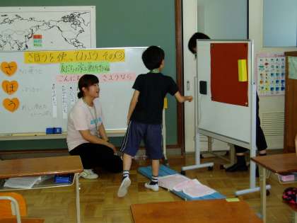 今日の学習は,「友だちの家に遊びに行った場面」です。まず,子どもたちは,いけない見本を見て,「ていねいに言わないとだめです。」や「帰り方やくつのぬぎ方がだめです。」など,自分の考えを発表しました。そして,その後,言葉や動作に気をつけてロールプレイをしました。このような学習を通して,よりよい人間関係を築く学習をしていきます。