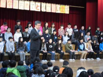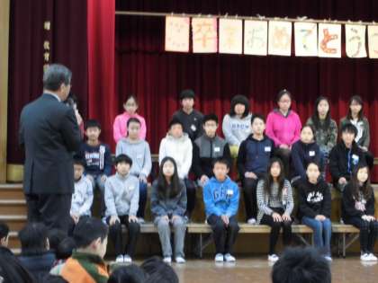 6年生のがんばっている姿を,数々お話されました。また,先日のノート検定での6年生の特にすばらしいノートだった人の発表もありました。