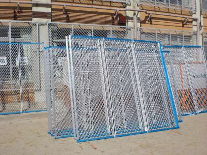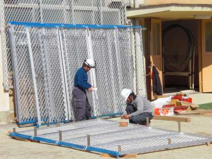 東校舎2階,運動場側の防球フェンスの取り付けが明日から始まります。写真は取り付けられる防球フェンスと取り付けのために部品をつけている様子です。