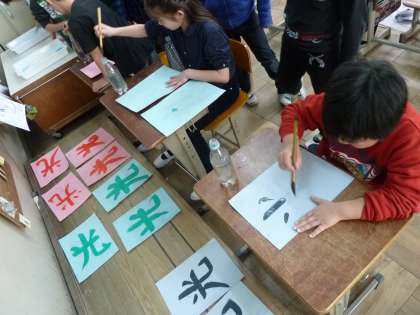 その翌日16日に2組も3年生の毛筆まとめ「光」を書きました。