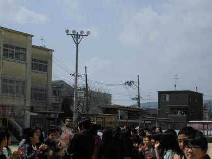 運動場で,在校生・保護者・教職員が花道を作りました。