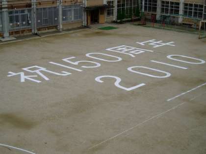 明親小学校150周年事業の一環で,明日,記念誌や記念品に利用する航空写真を撮影します。今日は,その準備として,校庭に校章等が描かれました。