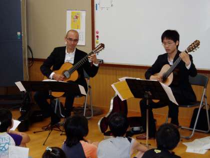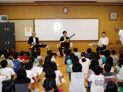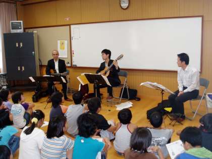 今日,3年生から6年生の子どもたちは,クラシックギターの生演奏を聴かせていただきました。演奏してくださったのは,『美山音楽祭』実行委員会の方々でした。優しいクラシックギターの音色を楽しむことができました。