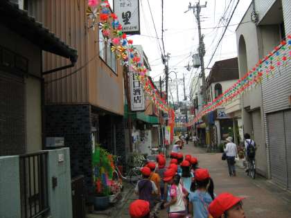 1年生は,生活科の学習で,淀のまちを探検しました。みどりの広場や本町商店街,淀城跡の公園などを探検しました。商店街には,全学年の笹飾りを取り付けていただいていました。