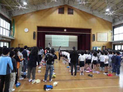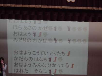 0421 児童集会その3 公開日 2016/04/21 更新日 2016/04/21 学校の様子 今年度の全校合唱も決まりました。「朝のリズム」という曲です。手拍子などが入り,とても楽しい曲です。ぜひ,ご家庭でも一緒に歌ってみてはいかがでしょうか。