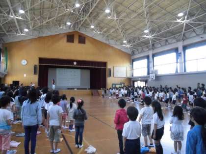 5月の児童集会がありました。6年生は1年生と若草を,5年生は,2年生を迎えに行きました。はじめの言葉の後は全校合唱です。リズムうちが少し上達してきました。