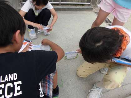 算数科の『算数実験室』の単元でかたむき分度器を作り,身の周りにある角を見つけ,いろいろな角の大きさを測定しました。学校内にはいろいろな場所,使用する物に傾きがあることや,その角度の大きさによって「急」や「ゆるやか」が決まるということが分かりました。
