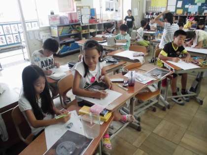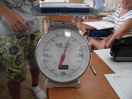 計量の意味を知り,計量と私をテーマに作品づくりを始めました。今日はアイディアスケッチを描きました。はかりやてんびん,計量カップなどの計量器具を見たり,触ったりしながら,イメージを膨らませました。
