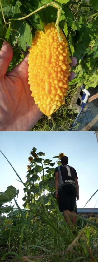 小学校では,4年生のツルレイシの実が黄色くなりました。