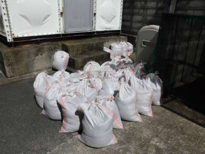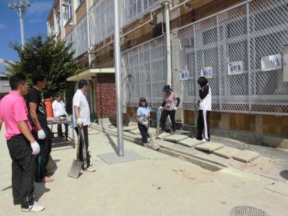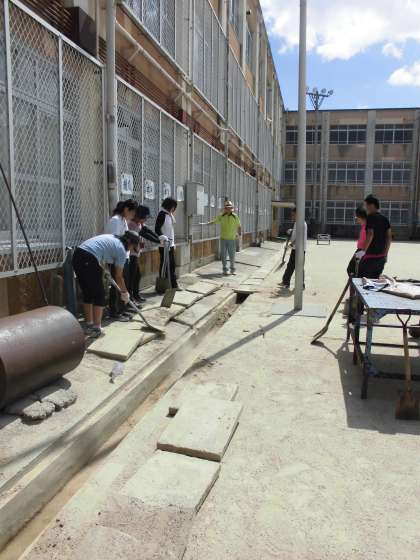 いよいよ明日から授業再開です。準備の一つとして職員作業を行いました。運動場の側溝の砂を除去し土嚢袋に入れました。